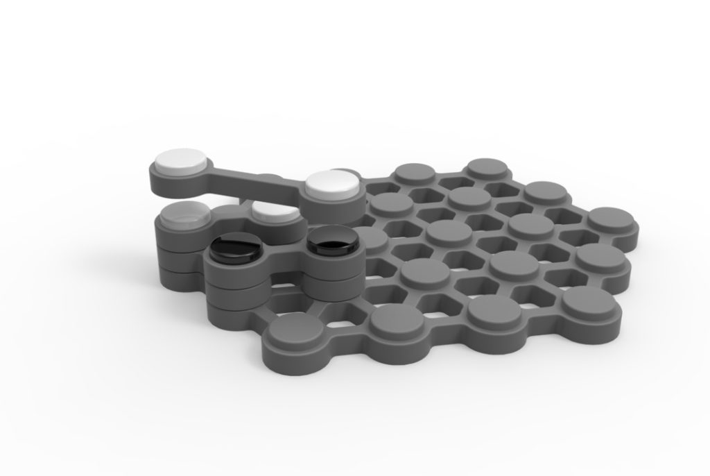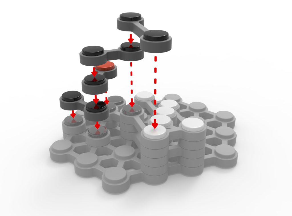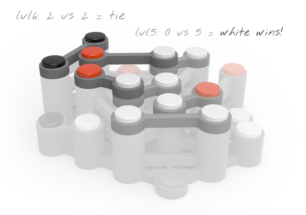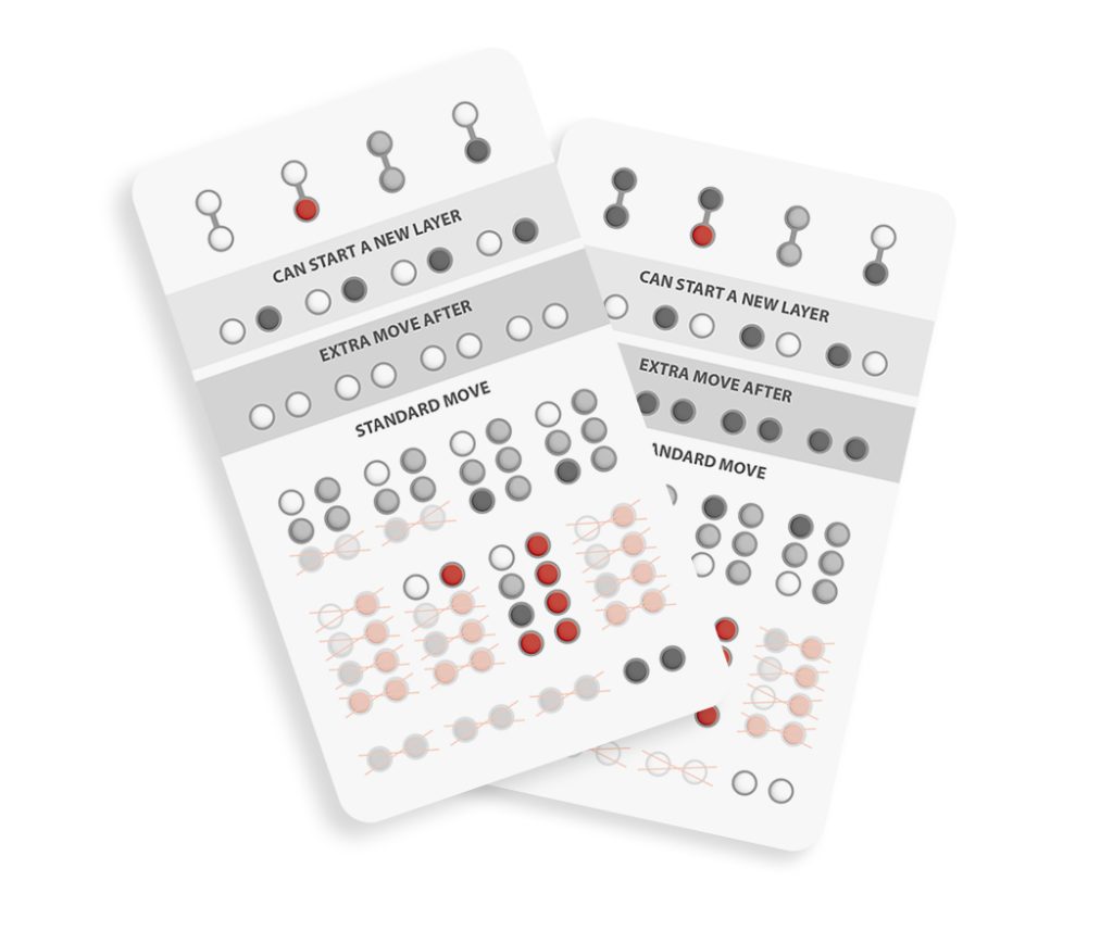 Jeśli chcesz położyć pionek na nowej warstwie, na której nie ma jeszcze żadnego pionu, możesz zrobić to JEDYNIE poprzez położenie go jednocześnie na polu białym i czarnym – od tej reguły nie ma wyjątku i jest to najważniejsza reguła do zapamiętania.